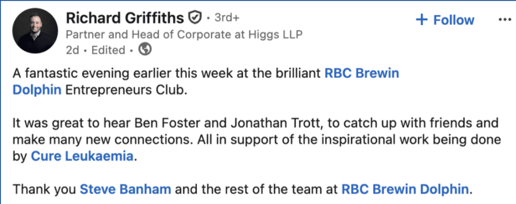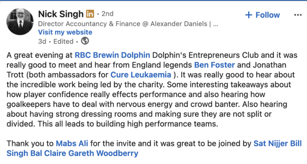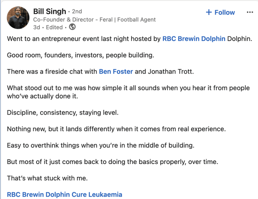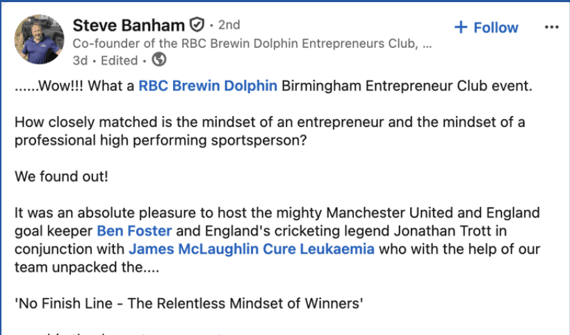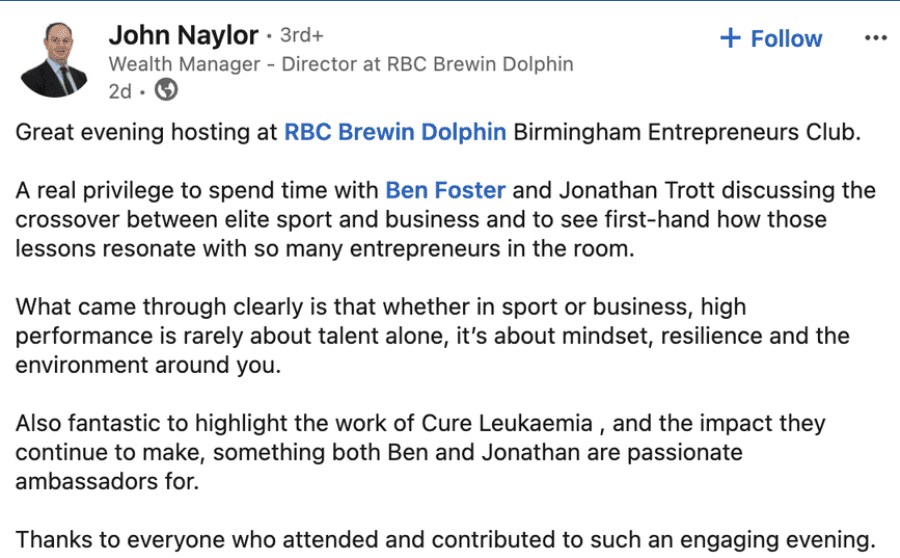 Really great evening yesterday at an event hosted by RBC Brewin Dolphin, thanks for the invite Mabs Ali Brilliant to hear from Ben Foster and Jonathan Trott, sharing honest insights from elite sport. A lot of what they spoke about really stuck with me, especially around what it actually takes to win consistently. There were clear parallels between sport and entrepreneurship. discipline, resilience, dealing with setbacks, and showing up every day when it’s not easy. Always valuable to step outside your own world and hear how high performers in different arenas think and operate. Looking forward to more conversations like this.