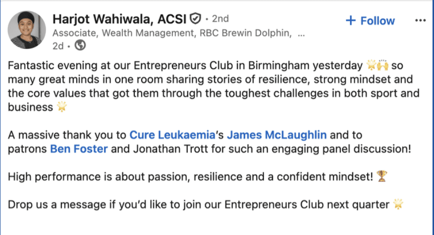 We would like to extend our heartfelt thanks to the entire team at RBC Brewin Dolphin for their continued hospitality and commitment. Partnerships like this ensure that we can continue to move the needle in the fight against blood cancer.